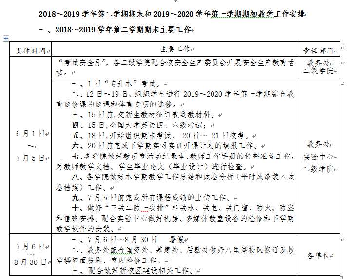 2018~2019学年第二学期教学工作即将结束,为了保证本学期各项教学工作顺利完成和下学期初教学工作正常运转,特制订《2018~2019学年第二学期期末和2019~2020学年第一学期期初教学工作安排》。经 6月20日校长办公会审定通过,现予以印发,请遵照执行。
