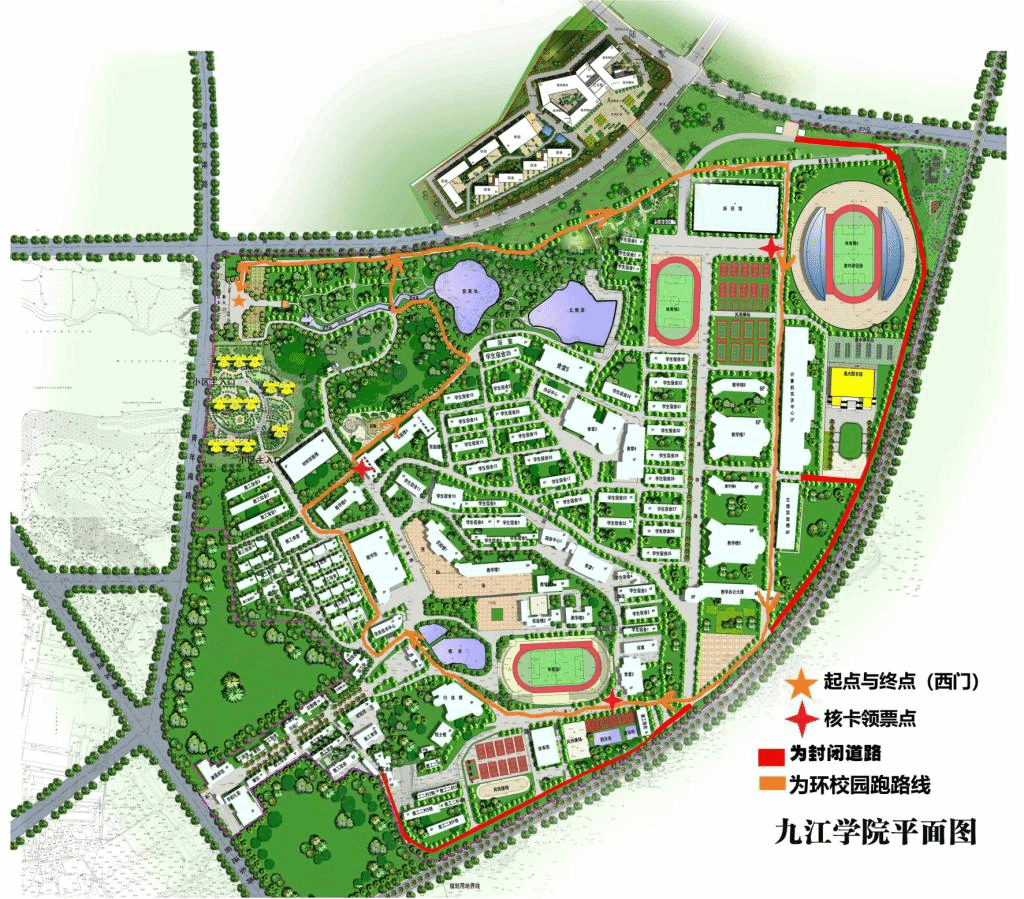 2、环校园跑路线:主校区西大门(起点)--(经紫阳路)--田径馆--(经青莲路)--文理实验楼--厚德楼--(经隆平路上坡)--白宫--蝶湖--(经教工三村路口)--校工会--(经梦阳路)--爱莲池--栖贤桥--(经紫阳路)--西大门(终点)。