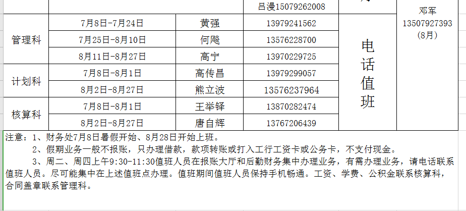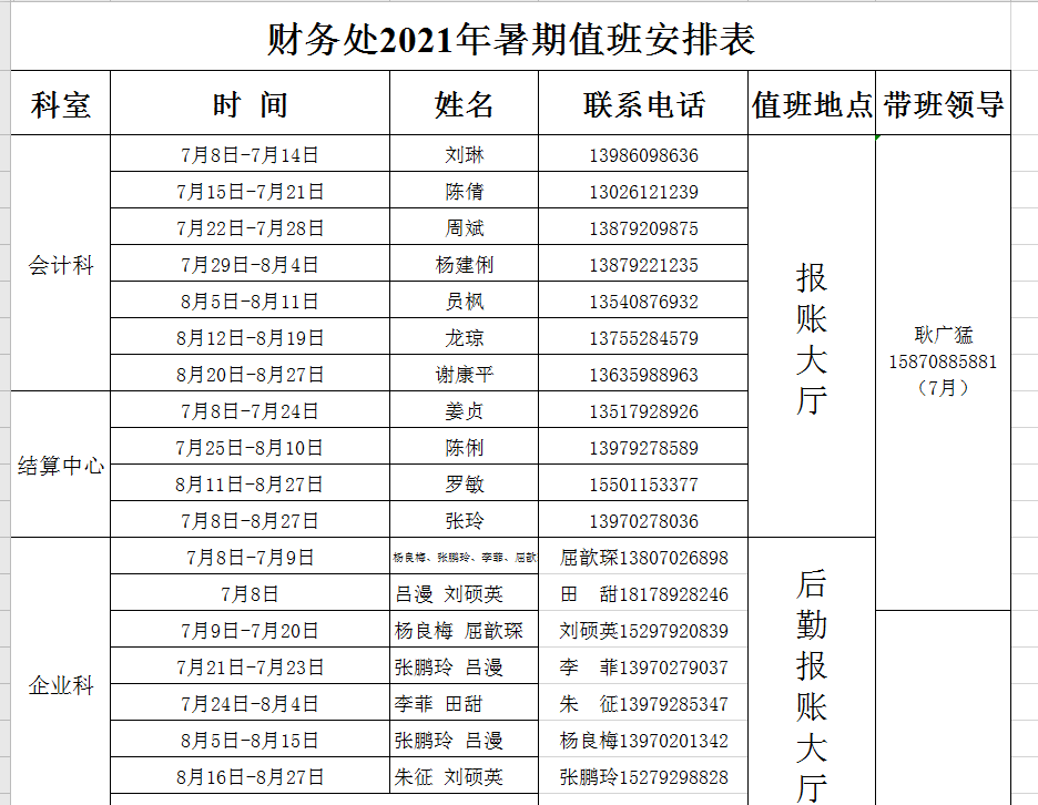 财务处2021年暑假值班安排表