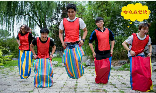 比赛要求:(1)队员必须站在起点线后接跳袋;(2)队员在比赛行进时若摔倒,必须回到原地重新再跳。(3)队员在穿袋子时必须在起点线后穿袋子;如有犯规出现,裁判员酌情处罚加时5秒;如有队员一人或多人犯规,裁判员酌情处罚加时10秒。(4)比赛根据抽签形式,每一组4个分会同时进行比赛。