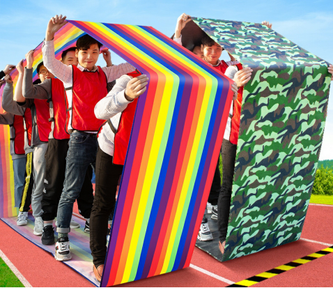 比赛规则:比赛开始,10名队员站在履带里面,在所有人的脚不直接接触地面的前提下,通过协调配合使整体团队在跑道,移动30米。同时,要保证团队移动是连续性和整体性的。以上各参赛队员所用的比赛器材尾部触及终点线为计时停止,用时最短者为胜。