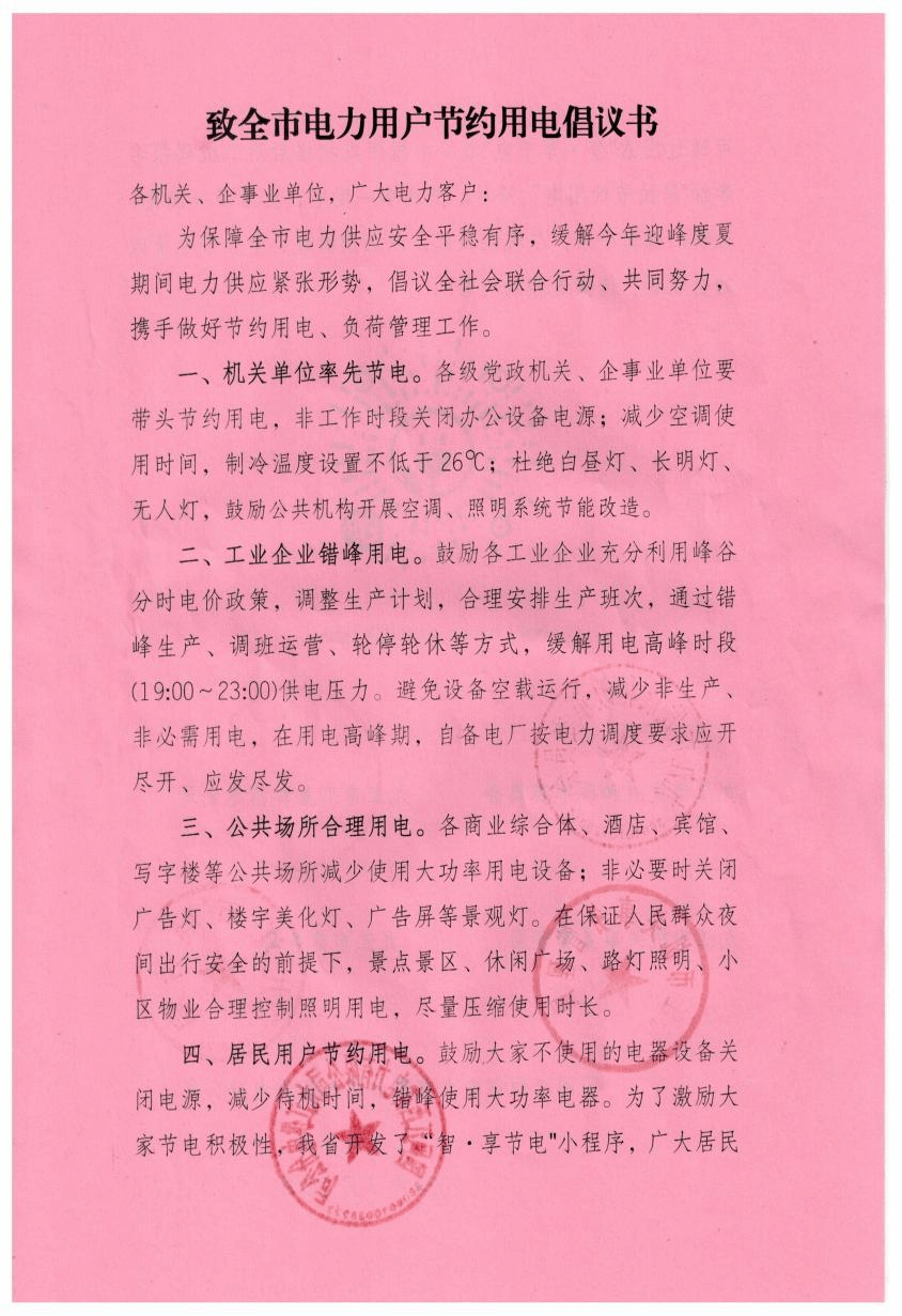 电是生命的光环。节约用电更是传统美德。节约不仅是美德,更是品质,是责任,是一种境界。“历览前贤国与家,成由勤俭败由奢”。让我们同心协力,做勤俭节约风尚的传播者、实践者、示范者,让“节约光荣,浪费可耻”的理念蔚然成风,用实际行动为祖国、为社会、为校园尽一份力量!接九江市发展和改革委员会、九江市工业和信息化局、九江市机关事务管理局、九江市商务局、国网江西省电力有限公司九江供电分公司联合倡议通知,让我们一起从自身做起,从节约一度电开始,创节约型校园,展和谐校园新貌!为此,我们提出以下倡议: