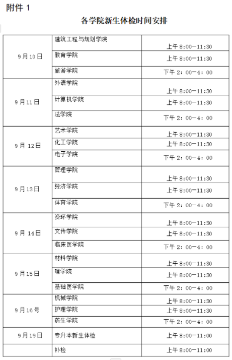 四、体检时间和地点安排(各学院体检时间详见《各学院新生体检时间安排》):
