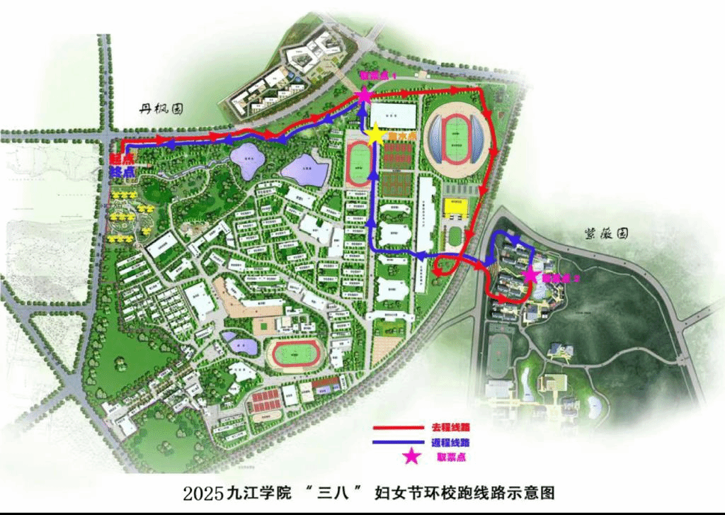 4.比赛中必须按照规定路线,依次在田径馆北侧和新校区学生生活二区中间路段设置2个取票地点,参加活动的女教职工需在取票点核验校园卡,领取经过票。