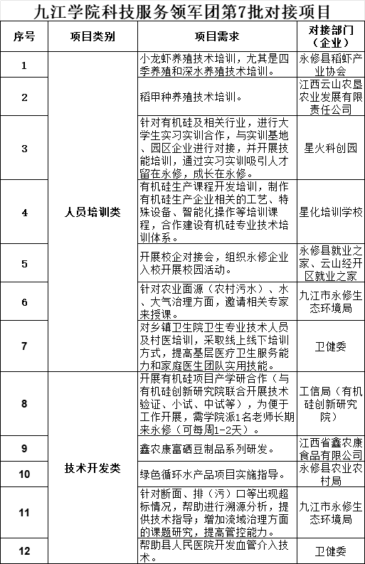关于发布九江学院科技服务领军团第7批对接项目的通知