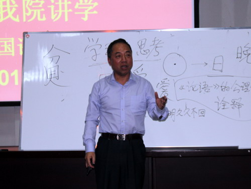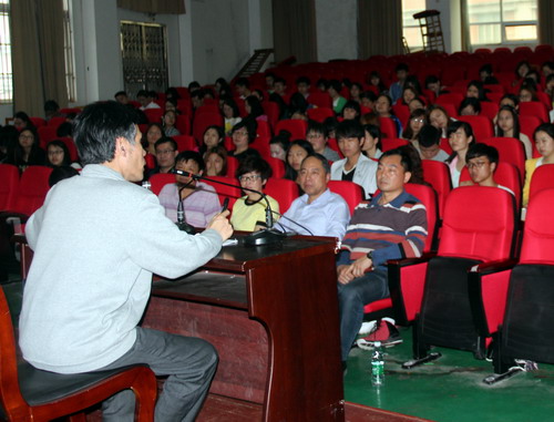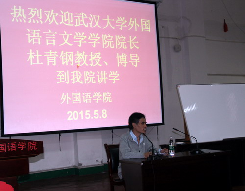 报告会上,杜青钢教授用风趣幽默的语言讲述了南宋谢石、皇帝宋高宗、明朝崇祯皇帝等的测字故事,用真挚的语言讲述了在他在海外留学的拳拳报国之心,并介绍了华裔学者程抱一(法兰西学院院士)在《中国诗歌语言》和《虚与实》中以中国文化的深邃,用纯美的法语感动法兰西,丰富了法国文化的佳话,上述言语旨在激发大家认识改革开放中国的伟大进步,引导大家在学习、思考中国传统文化的同时,如何做好与西方文化的比较,激发师生在做好国学与西学的比较鉴赏中的兴趣。