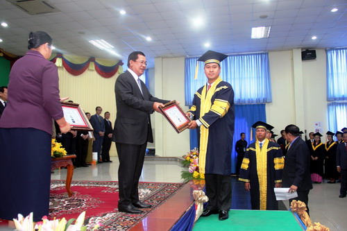 5月11日,柬埔寨亚欧大学举行2015年度毕业典礼,柬埔寨政府洪森总理(H. E. HUN SEN)发表演讲并亲自为毕业生代表颁发毕业证书。