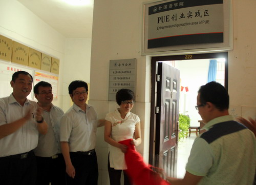 在热烈地掌声中,王万山副校长、校团委书记闫来英、企业家代表与外国语学院院领导一同为PUE创业实践区揭牌。王万山副校长一行还走进创业实践区,了解企业产品、运营模式,高兴地观看学生们的实际操作。