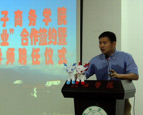 校友刘鹏飞作为企业代表做了发言,他表示能参加此次签约仪式非常荣幸。电商的发展是未来的大趋势,我校在义乌的校友大都从事电子商务行业,学校成立电子商务学院,让校友们很有归属感。电子商务学院的发展,电商实践要放在首位。希望能与学校和电商学院进行深入的合作,也希望各位企业家和广大的校友企业全力支持母校和电商学院的发展。学生创业团队代表初贺以校园文化创意产品鹿小白为例上台讲述了自己的创业感悟和体验,并表示学校推出的创新创业教育和电商学院实施的“创业团队培育计划”对学生的创业有着非常大的积极影响,渴望学校和企业搭建更好的创业平台,为学生创业打下更加牢固的基础。