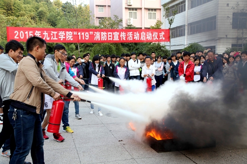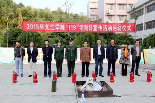 在第二十五个“119”消防宣传日的到来之际,11月4日下午,我校2015年119消防宣传月启动仪式在向学广场举行。校纪委书记魏立平、庐山区消防大队参谋邓雨欣,校保卫处、学生处、文传学院、理学院、会计学院、化环学院等部门负责人及学生代表约400余人参加了此次消防宣传及运用消防器材进行灭火的演练活动。