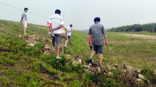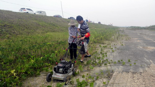九院团干在赤湖堤上除草