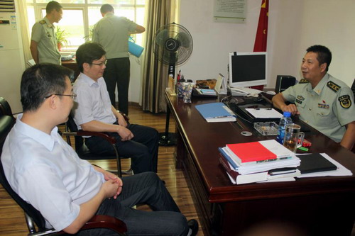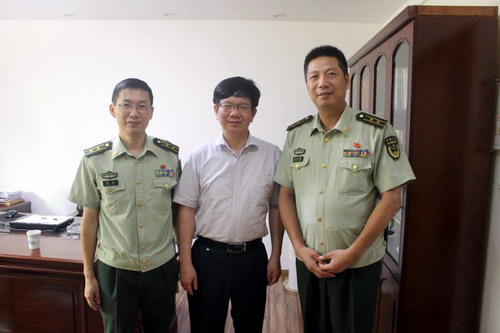 王万山副校长一行首先来到九江市消防支队,同陈志明副支队长一行进行了座谈。王万山副校长首先向九江消防全体官兵致以节日祝贺和慰问,对消防官兵多年来给予我校消防工作的大力支持表示感谢。陈志明副支队长对王万山副校长的到来表示感谢,对多年来与学校保持的军民共建关系予以了肯定,在向王万山副校长简单介绍了支队情况后,就进一步加强师生消防业务培训等进行了欢快的交流与探讨。