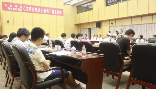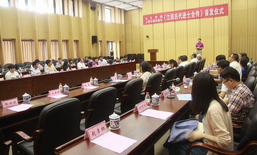 在首发仪式上,九江学院庐山文化研究中心常务副主任李宁宁教授介绍了《江西历代进士全传》编纂缘由及经过。自2012年3月,成立《江西历代进士全传》编纂工作委员会以来,九江学院集中全校的研究力量,启动《江西历代进士全传》的编纂工作。四年来,直接参与编撰的校内教师和研究人员多达52名,校外专家2人。参编专家深入国家图书馆、上海图书馆等国内大型图书馆,查找方志、家谱、碑刻等各种文献资料,复印了近30000页的进士传记材料。编纂过程中,专家们经常就某个进士归属某县或某个进士的双重籍贯问题进行讨论,或者为材料的多寡均衡问题而费尽心思,或者为寻找某篇文献的最早出处而上下求索。2015年完成初稿后,又用了一年时间进行加工打磨。