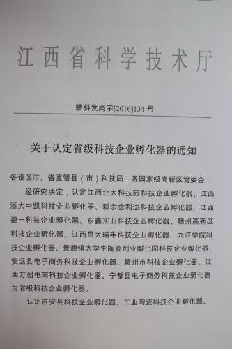 日前,从江西省科技厅公布的《关于认定省级科技企业孵化器的通知》(赣科高发字[2016]134号)获悉,我校大学科技园获批省级科技企业孵化器。这是继我校大学科技园2015年12月由江西省科技厅、江西省教育厅联署认定为省级大学科技园以来又一个省级荣誉。