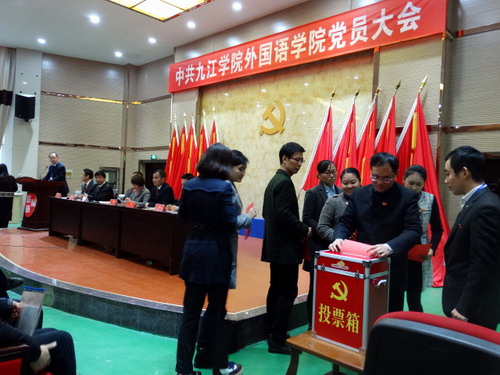 大会酝酿通过了外国语学院新一届党委委员候选人名单,表决通过了总监票人、监票人名单。根据《中共九江学院外国语学院党员大会选举办法》,以无记名差额选举的方式,由全体正式党员投票选举产生了新一届中共九江学院外国语学院委员会委员(以姓氏笔画为序):王伟、邓海波、杨杰、罗其娟、柴克清、韩琨、彭晓。