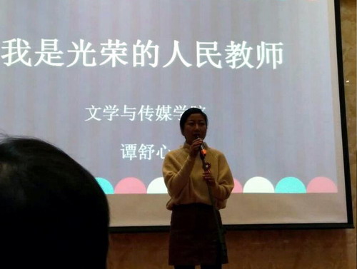 此次师德师风演讲比赛有来自经管学院、文传学院、艺术学院、电商学院、体育学院、基础医学院等20个二级学院共20位优秀教师参加。此前,各二级学院已自行组织了初赛,并推荐一名教师参加学校决赛。经过前期准备和初赛选拔,各位老师显然是有备而来,PPT制作精美、背景音乐恰到好处,更重要的是他们怀揣着一腔热爱,将一纸真情、数载岁月演绎得淋漓尽致。他们在教育事业中掬责任之心奉献三尺讲台,在这里他们以一纸箴言诠释热爱。选手们精彩的演讲感染了在座评委与全场观众,把比赛的气氛一点点推向高潮。19号选手,文学与传媒学院谭舒心老师带来的题为《我是光荣的人民教师》的演讲,她感情真挚地讲述了自己从长时间处于各种压力之下,积劳成疾,到面对父母的愧疚自责和面对自己的迷茫无助,最后终于在两年后重新走回教室、走上讲台的真实经历。讲稿内容紧紧围绕主题,事迹真实生动、发人深省,演讲流畅清晰、富有感情,深深打动了在座的老师同学们。