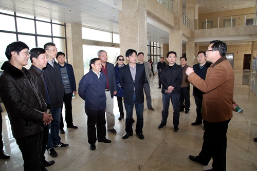 在艺术学院新区,杨耀防副校长代表学校对考评组一行的到来表示了热烈的欢迎,并向卢福财厅长一行简要介绍了学校的发展以及节能工作情况。同时,他还就学校作为九江市的接受省考评组考察单位之一表示荣幸和感谢。