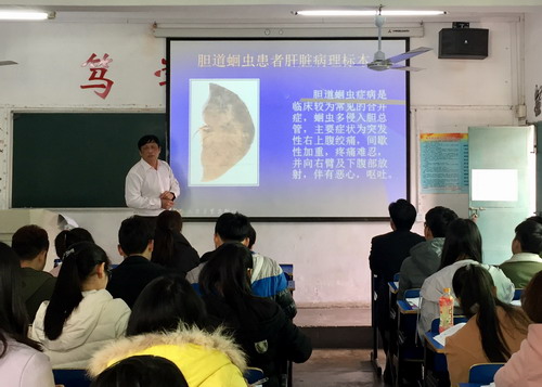 课堂上,汤自豪老师讲授的内容是肠道寄生虫的相关知识,汤老师授课条理清晰,联系临床实际,举例恰当,学生认真听讲,积极和老师互动,课堂教学效果良好。