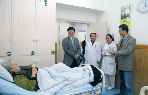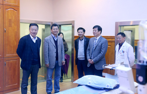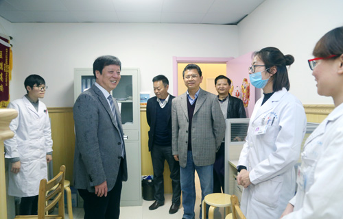座谈会后,刘校长一行还参观了临床医学院/附属医院东院门诊部、住院部、新大楼建筑工地及西院门诊部、住院部等,在东院介入室、VIP病房、中医馆、休闲吧、CT室及西院放疗科、休闲庭院等……每发现一个亮点,刘校长都不禁用手机拍照,留下资料。在内分泌科病区,刘校长还亲切与医护人员交流,慰问了住院患者,嘘寒问暖,关心患者身体恢复状况,并为患者送上祝福。几位住院患者主动向刘校长反映在我院的就医体验,都表示对医院的医疗水平和服务质量非常满意,医院环境好,住院条件好,医护人员很负责,随叫随到,细致周到,可爱可敬。听到患者的评价,刘校长非常高兴,并对患者的选择表示感谢。在其他所到之处,刘校长和医护人员亲切交谈,始终面带慈祥的微笑。和蔼的目光,亲切的问候,代表的是学校对附院的坚定支持和对医务工作者的关心关爱,传递的是对附院砥砺奋进、再创佳绩的殷切期望。