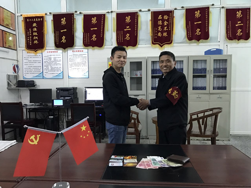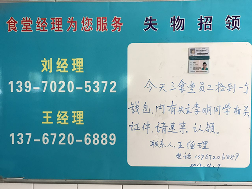 2017年4月9日8:40,三食堂门卫梅秀文在餐椅上拾到了一个男士钱包,内有现金若干、银行卡、身份证等重要证件,梅师傅根据后勤管理处饮食服务中心失物招领管理流程,第一时间将失物交给三食堂经理王焱平,王经理立刻按照失物寻主的流程登记保管,迅速拍照发布通知在食堂失物招领QQ群、食堂工作微信群和三食堂失物招领发布栏等处,等待失主前来认领。