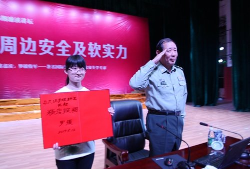 报告中,罗援将军从一个中国军人和国家安全战略学者的视角,深刻分析了我国周边安全环境和国防战略面临的形势,对朝鲜半岛危机以及钓鱼岛、东海、南海的历史和现状做了全面深入地剖析,并提出了中国在东北亚安全方面的政策主张,即在“主权归我”的原则上,要在争端区域强调“六个存在”——行政存在、法律存在、军事存在、执法存在、经济存在与舆论存在。罗援将军系统深刻地阐述了加强软实力建设的重要性、必要性。他辨证地阐述了和平与战争的关系,一方面要尽一切努力争取和平,另一方面要做好军事斗争的准备。他指出,我国的发展不仅是GDP的提高,还包括国防的发展,更包括全民素质的提高,是全面、综合、平衡的发展。要把安全、主权放在国家发展的重要位置,既要抓物质文明建设,也要抓精神文明建设;既要抓软实力建设,也要抓硬实力建设,从而使我国立于不败之地。罗援将军还引用老一代革命家的名言警句,对在校大学生提出了殷切希望。