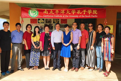15日上午,在中国驻瓦努阿图大使馆秘书武恒旭的陪同下,巡讲团一行来到南太平洋大学瓦努阿图校区孔子课堂开展座谈和讲座,中瓦友好协会代表 、维拉港中华公会代表以及孔子课堂教师参加了活动。