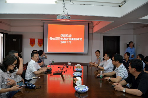 5月21日,研讨会部分专家学者到中国科学院鄱阳湖湖泊湿地观测研究站进行实地考察与交流。参观了观测站的气象观测场、物质输移模拟实验场、湖泊湿地生态恢复研究实验场和湖泊水文自动监测站等试验基地,并与观测站的研究人员进行了学术交流。