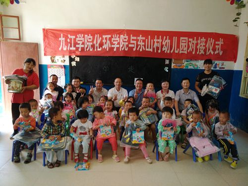 9月14日,九江学院化环学院与东山村幼儿园对接仪式在东山村幼儿园举行。化环学院刘新强一行5人、官莲乡乡长邓卢武参加了对接仪式。仪式上,化环学院为幼儿园递交了2000元扶贫款。仪式结束后,还为26名幼儿园小朋友送上了书包和玩具等。小朋友天真灿烂的笑容,感动着现场每一个人。