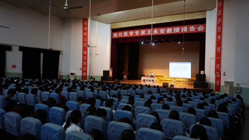 王永安教授向听众介绍了他所在的军事医学研究院承担的研究任务和工作职责,介绍了自己所从事工作内容。他强调,对祖国和人民要无限忠诚,关键时刻要敢于担当,对待事业要追求卓越,正是原于忠诚、担当和卓越的信念和品质,使他完成了叙利亚化武海运护航、天津8•12事故处置、为战而研和为赢而研等重大活动卫勤保障及应急处置和科研等光荣而艰巨的使命。