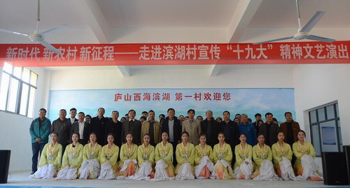 上午10时,在服务中心礼堂举行了新时代、新农村、新征程——走进滨湖村宣传“十九大”精神文艺汇演。演出开幕前,东山村党政授予东山村帮扶单位九江学院“荣誉村民”荣誉称号,编号为001号。九江学院党委委员、副校长杨耀防发表了热情洋溢的致辞。他说,党的十九大从战略和全局的高度,把脱贫攻坚作为全面建成小康社会决胜期必须坚决打好的三大攻坚战之一。作为省派单位,九江学院高度重视扶贫工作,将和东山村干群一起,认真学习贯彻党的“十九大”精神,牢记使命和责任担当,深入扎实推进各项工作,以优异的成绩迎接省第三方评估,确保2017年底脱贫目标如期实现。学校扶贫工作队要和东山村对照贫困村退出指标体系逐一排查,按期确保人人脱贫,决不落一人。