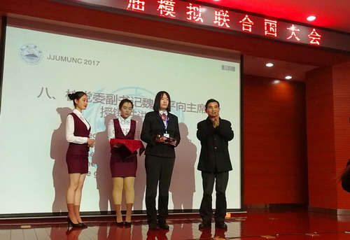 魏立平为大会主席颁发“模联法锤”并致开幕辞。他指出,在全球化趋势不断增强的今天,中国更加积极地参与全球治理体系改革和建设,不断贡献中国智慧和力量。教育应该适应这一形势,增强学生的国际意识和国际视野,培养更多走向世界的开放型、复合型人才。学校开展模拟联合国活动就是这一教育理念的具体化表现,也是我校第二课堂活动的创新与拓展。通过此活动,让青年学生有机会去深刻体会联合国的和平的理念和理想主义精神,为推动人类命运共同体建设,为创造人类的美好未来而不懈努力。他希望各位代表能将模联“心怀天下”的责任意识延续到生活中,也期待代表们在会场上提出新颖可行的解决方案,为世界和平贡献自己的力量。