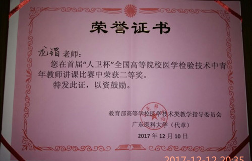 为进一步提升全国高等院校医学检验技术中青年教师的教学能力和业务水平,展示中青年教师教学风采,12月8日至10日,由教育部高等院校医学技术类教学指导委员会和人民卫生出版社共同主办的首届“人卫杯”全国高等院校医学检验技术中青年教师讲课竞赛在广东医科大学东莞校区举行,我校基础医学院病原与免疫教研室龙锴博士、临床医学院/附属医院医学检验教研室韩峰老师参加此次竞赛,两人均荣获二等奖。