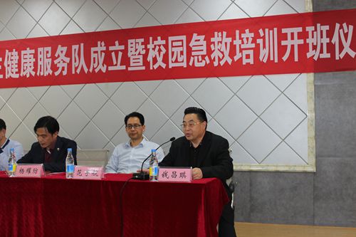 为了更广泛地在校园内开展和普及应急救护知识与技能培训工作,切实提高我校师生的安全防范意识、防灾避险和自救互救能力,4月12日下午,在学生处、团委、保卫处的支持与配合下,由校医院组织的“校园卫生健康服务队成立暨急救员培训班”开班了。杨耀防副校长到会并讲话,九江市红十字会石金平主任、九江市红十字会救护培训部钱昌琪主任,保卫处张晓明处长、学工部范宇航副部长、校医院贾宗林院长等参加了此次开班仪式,仪式由校医院贾宗林院长主持。
