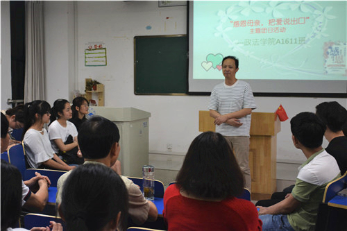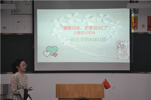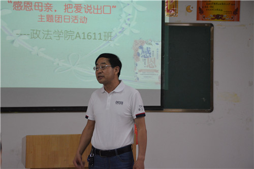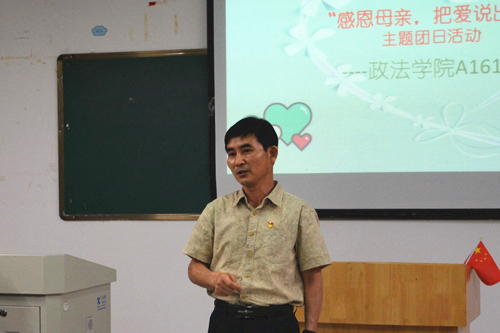 “我们可以走得很远很远,却总也走不出,母亲心灵的广场。”在政法学院“感恩母亲,把爱说出口”主题团日活动上,校党委副书记魏立平饱含深情的朗诵,使在场师生不禁潸然泪下。为了培养大学生知恩感恩的良好品德,弘扬中华民族传统孝道文化,5月13日晚,政法学院A1611团支部在八里湖校区综合楼422教室开展了 “感恩母亲,把爱说出口” 主题团日活动。校党委副书记魏立平在八里湖校区管理办公室书记邓燕的陪同下参加了本次团日活动,政法学院党委书记高翔、团委刘梦老师和班主任李仲文老师也参加了活动。