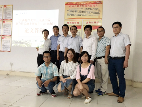 6月1日,由九江学院与江西财经大学联合培养的第一届国际商务硕士毕业论文答辩会在义丰楼619圆满完成。此次答辩的答辩委员会由江西省社科院副院长孔凡斌教授、江西财经大学国际经贸学院刘建副院长、黎新伍教授、南昌大学经管学院许水平博士以及我校经管学院周业付教授共同组成,孔凡斌教授担任答辩主席。答辩会开始之前,校长刘晓东、副校长王万山专程到义丰楼看望了孔凡斌教授一行,并就硕士点申报和硕士生培养等问题进行交流。