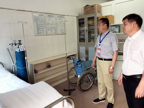 6月12日上午10:25—11:00,专家组成员苗金海教授到校医院进行走访。在贾宗林院长陪同下,苗金海教授先后参观了注射观察室、急诊抢救室、换药室等科室,询问了校医院服务师生的门诊医疗工作情况。随后,苗金海教授来到院长办公室,听取了贾宗林院长关于校医院的医疗保障服务、公共卫生防疫和健康教育的工作汇报。