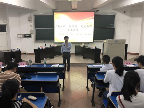 6月13日晚,旅游与国土资源学院党建活动月系列活动之 “新时代、新思想”党建知识竞赛决赛在竞知楼阶梯教室四举行,副校长王万山为获奖代表队颁奖并对比赛进行了点评,旅游与国土资源学院党委书记黄伟及学生党支部全体党员、入党积极分子共计两百余人观看了比赛。