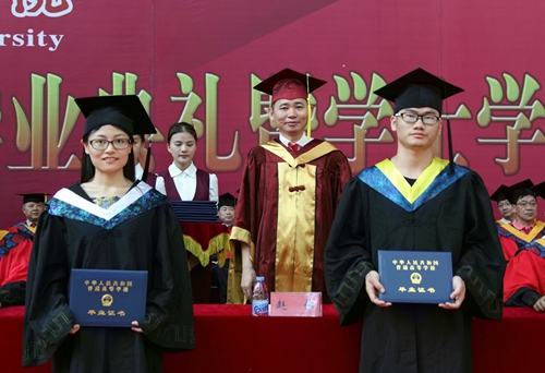 校党委书记赵伟为优秀毕业生代表颁发了毕业证书,全体校领导为毕业生代表拨流苏。