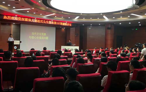 9月10日晚,资深媒体人,昆仑策研究院高级研究员,中国社会科学院国家文化安全与意识形态建设中心特约研究员郭松民先生应邀做客我校第167期濂溪讲坛,在逸夫图书馆学术报告厅作了题为“当代文化现象与核心价值观问题”的讲座。讲座由党委副书记魏立平主持。
