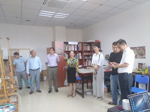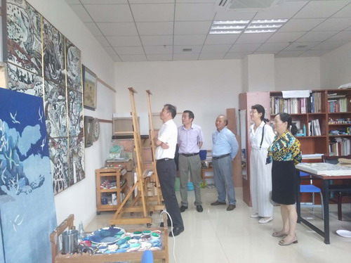 在学校去年引进的高层次人才王静漪老师的工作室,赵伟书记认真欣赏了王静漪老师所作的岩彩壁画作品,并与王静漪、刘结锋等青年老师进行了亲切交流,肯定了他们在工作上所作出的努力,并希望近两年来引进的高层次人才尽早成长为艺术学院发展过程中的黄金一代。
