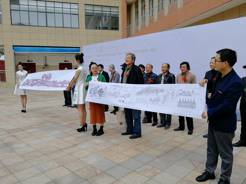 校友代表饶国安代表77、78级毕业生讲话,并将九江旧城改造壁画设计作品《浔城记忆》和《庾亮传奇》的创作设计图赠与母校。