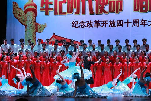 各院学子歌声高亢嘹亮,他们誓要唱响风华正茂的岁月,更要直抒对祖国的深深热爱。每支合唱队风格各具特点,服饰或素如白衫青衣,或艳如红裙金带;点缀或霓裳曼舞,或铿锵诵读,或金戈铁马。大家怀着对祖国的挚爱,怀着对改革开放的深厚情感,尽情歌颂伟大祖国铸就辉煌的40年,歌颂学校跨越腾飞的奋斗历程,比赛现场高潮此起彼伏。