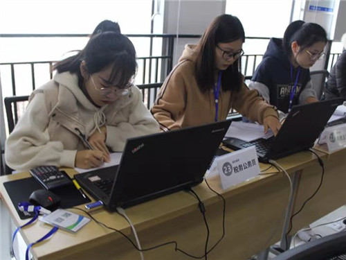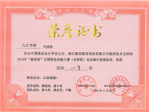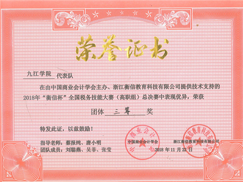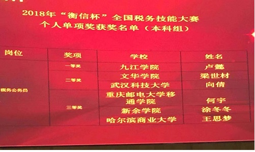 2018年全国税务技能大赛总决赛于11月21、22日在浙江杭州成功举办。九江学院代表队在领队会计学院党委副书记罗维、指导老师蔡报纯副院长、唐小明老师带领下,2016级会计学专业卓越班黄小凤、龚亚男、卢懿三名同学不负众望,以323.227分的总成绩获得本科组团体总分第一名,卢懿取得税务公务员岗位个人奖第一名,黄小凤取得办税员岗位个人奖第二名。同时,九江学院会计学院刘聪燕、吴菲、张莹三名同学获得专科组“团体三等奖”。