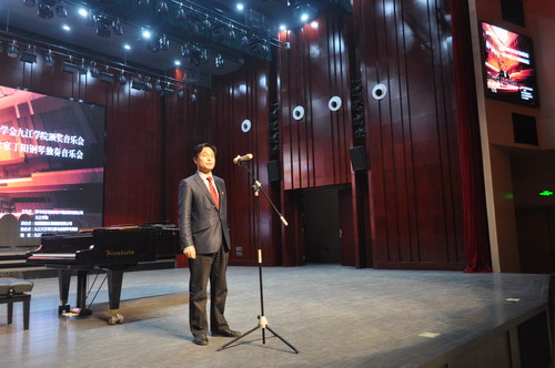 11月22日晚,2018雅马哈亚洲音乐奖学金九江学院颁奖音乐会在九江学院艺术学院音乐厅举行。副校长杨耀防到会致辞。艺术学院党委书记王春生、副院长欧阳时来,雅马哈乐器音响(中国)投资有限公司钢琴营业科担当科长沈毅先生、钢琴营业科主任徐皓伦先生、南昌赣盟乐器销售有限公司王雅纹总经理,艺术学院音乐学专业师生、及社会各界人士齐聚艺术学院演播厅,参加了雅马哈九江学院奖学金颁奖仪式,欣赏了特邀艺术家丁阳博士的钢琴独奏音乐会。