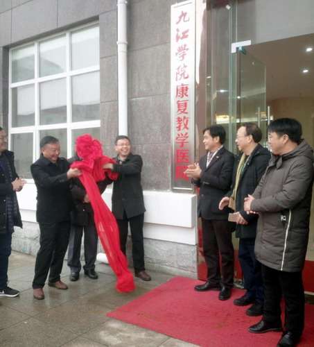 为了加快学校康复治疗学专业建设,促进康复医学学科发展和专科临床医学专业就业分流,充分利用都昌县中医院康复医学的临床教学资源,九江学院医学部与都昌县中医院决定联合共建九江学院康复教学医院。在都昌考察期间,杨副校长与都昌县人民政府江期论副县长等一起为“九江学院康复教学医院”成立揭牌。