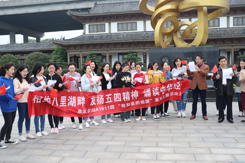 “九派浔阳山水间,鄱阳湖上潮动天。风劲帆张涛声激,辉煌征途史无前”。作为“我和我的祖国”庆祝新中国成立70周年主题教育活动之一,4月28日下午,政法学院A1611班全体同学赴八里湖九派诗廊开展“相约八里湖畔 发扬五四精神 诵读中华经典”主题实践活动。校党委副书记魏立平作为联系该班的“双体验”校领导应邀出席,八里湖校区管理办主任邓燕、政法学院党委书记高翔、班主任李仲文及院团委刘梦老师一同参加。