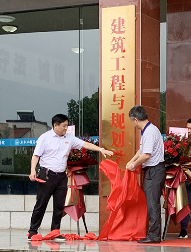 在欢快的乐曲声中,夏启国副校长与建工学院李华锋院长一起为建筑工程与规划学院揭牌,现场响起热烈的掌声。