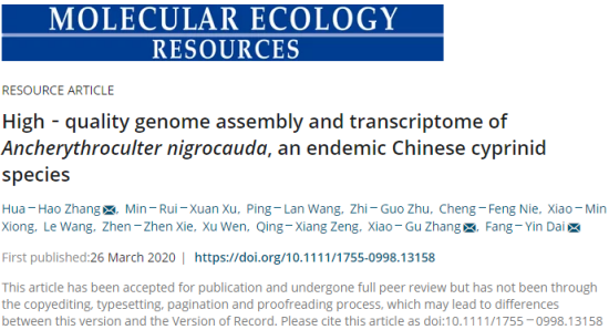 近日,我校药学与生命科学学院教师张化浩博士的研究团队与西南大学和赣州市水产研究所合作的研究成果以题为《High-quality genome assembly and transcriptome ofAncherythroculter nigrocauda, an endemic Chinese cyprinid species》发表在《Molecular Ecology Resources》上。《Molecular Ecology Resources》是生物进化领域权威期刊,其最新影响因子7.049,为一区Top期刊。这是继张化浩博士团队近日在《Nature Communications》发表成果后的又一重要研究进展。