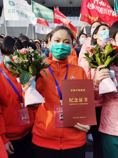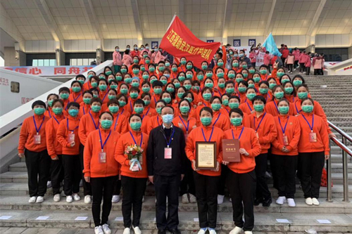 在这支队伍当中,有来自九江学院附属医院第二批支援湖北医疗队员——殷美霞和章婷。从2月7日凌晨两点起,她们正式进入洪山体育馆方舱医院,作为九江支援湖北护理队队长、江西护理医疗队护理组长,殷美霞、章婷带领着她们各自护理团队,每天为160多位新冠肺炎患者进行医疗护理工作。3月10日下午3点半,随着最后一批49名患者从方舱医院治愈出院,运行了35天的武汉市首个方舱医院正式休舱,在这35天里,殷美霞、章婷所在的“江西护理队”方舱C区共收治282名患者,她们的“江西护理排班模式”被制定成模板推广到了青海、广西、河北等医疗护理队,她们被国家卫健委授予“全国卫生健康系统新冠肺炎疫情防控工作先进集体”称号,被江西省妇联授予“江西省三八红旗集体”称号。殷美霞因在疫情防控斗争中表现突出,获中共九江市委组织部、九江市人力资源和社会保障局通报嘉奖。
