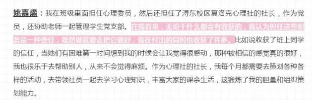 姚嘉燏:谈不上啥经验,就是把自己的时间安排得比较满,每天都过得很充实,我在我们寝室待的时间是最少的,不是兼职就是办活动,或者学习。大一时候学习不太紧张,就做了兼职。兼职主要是在学校设立的勤工俭学岗位――食堂和图书馆,社团活动策划是一个礼拜一次,一个礼拜大概花三四个小时去思考和计划,花两个小时开会,花半天的时间和社员们一起去完成,还是比较OK的。